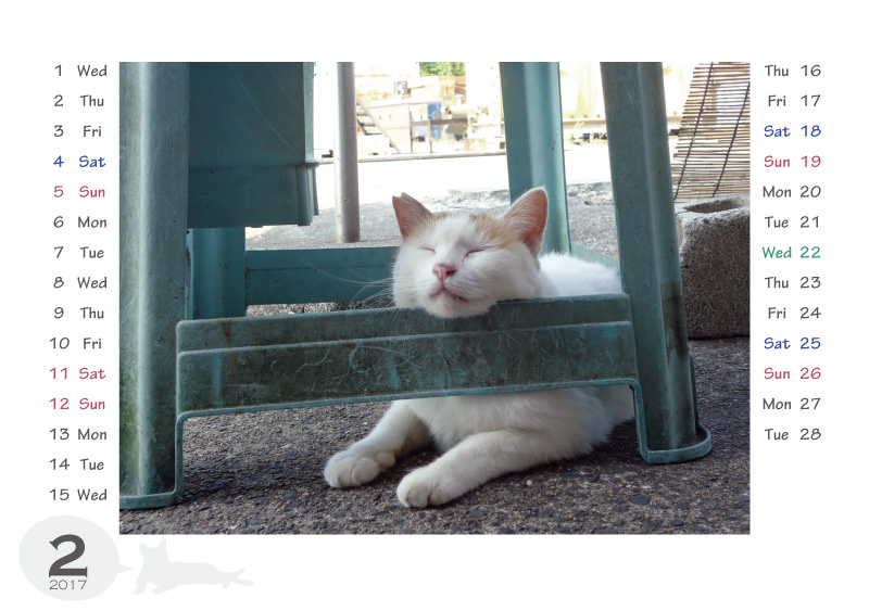 壁掛けカレンダーのレイアウトは例年通りです。毎月1つ、ねこにゆかりのある記念日を載せています。2017年5月は、11日がミュージカル『キャッツ』初演(ロンドン、1981年)となります。